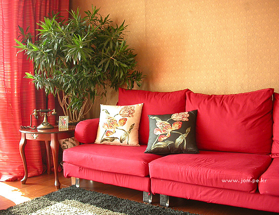 빨강 참 어울리기 힘든 색인데 멋들어지게 어울리네요. 가구도 멋진 쿠션도... 초록 화분 덕에 더 그런가봐요.